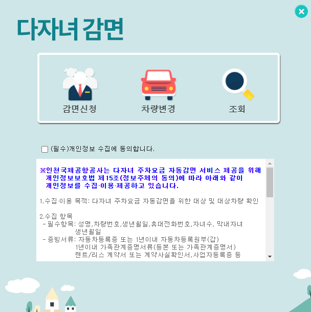 ● 개인정보 입력: 팝업창에서 개인정보 수집에 동의하고 [감면 신청]을 선택합니다.