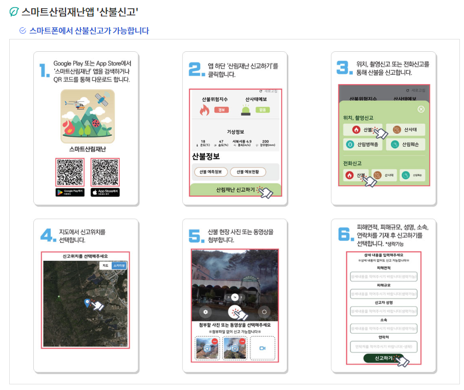 전화하기: 산불을 발견하면 즉시 산림청(042-481-4119), 소방서(119), 경찰서(112)로 전화하세요. 전화를 걸 때는 상황을 간단명료하게 설명합니다. 산불신고 앱을 이용해서 신고할 수 있습니다.